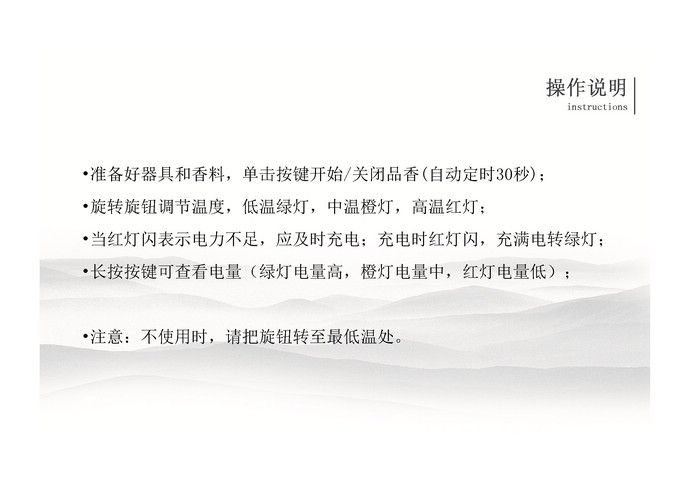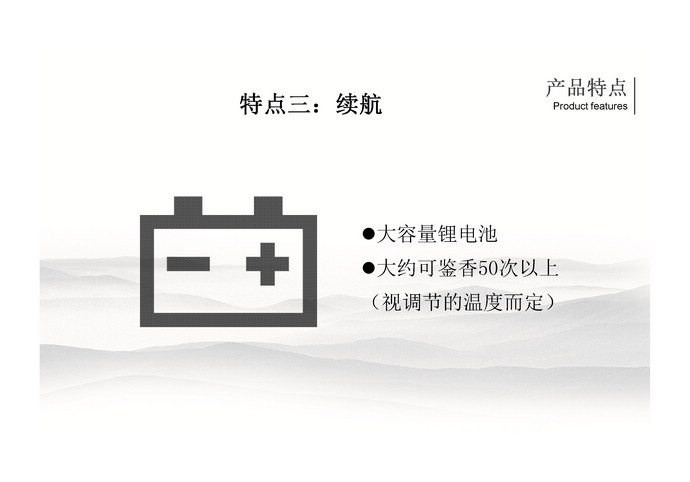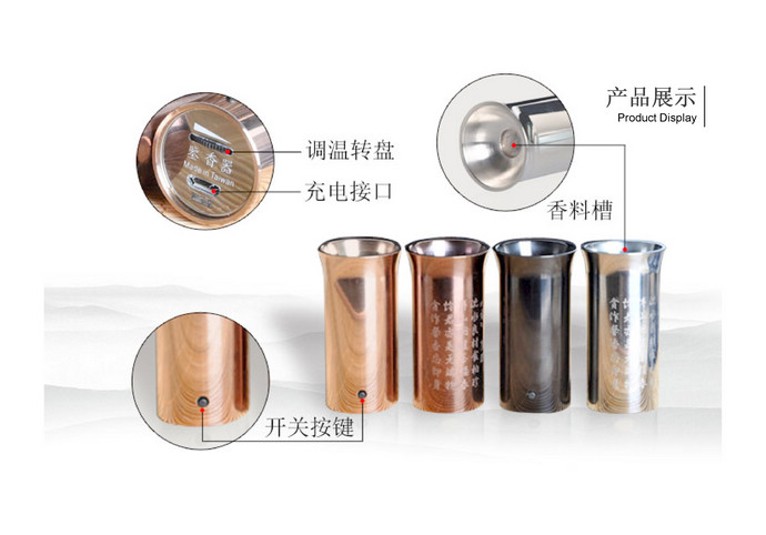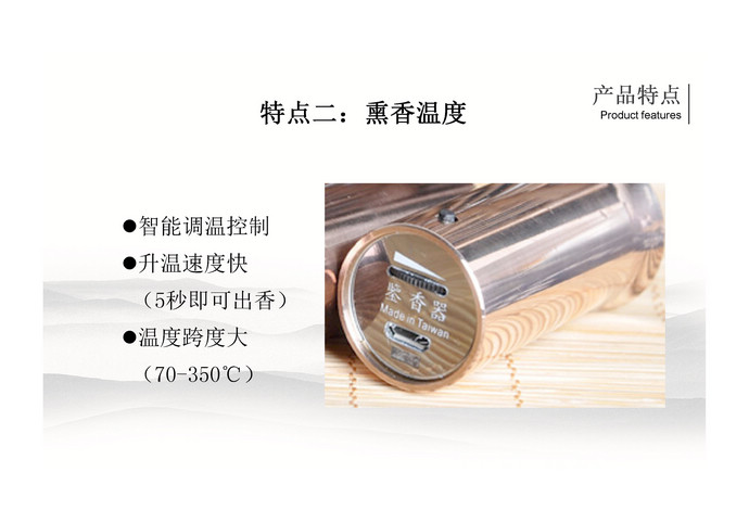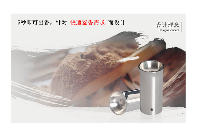 該產(chǎn)品為滿(mǎn)足快速鑒香需求而設(shè)計(jì),5秒內(nèi)即可出香。外殼采用不銹鋼,全金屬外殼,堅(jiān)固耐用,手感極佳。器形精致小巧,便于攜帶,重量只有75g,比普通的智能手機(jī)輕一倍。底部拔盤(pán)式調(diào)溫,溫度調(diào)節(jié)范圍為70~350℃。內(nèi)置可充電鋰電池,每次鑒香使用30秒,滿(mǎn)電量時(shí)可以使用50次左右。